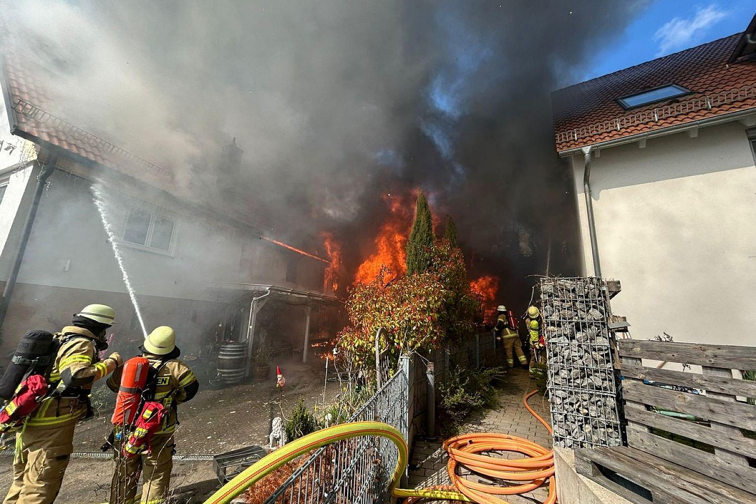 Vor Ort stand eine Garage mit einem Pkw und drei Motorrädern in Vollbrand, die Flammen waren bereits auf das Nachbarhaus übergegriffen.