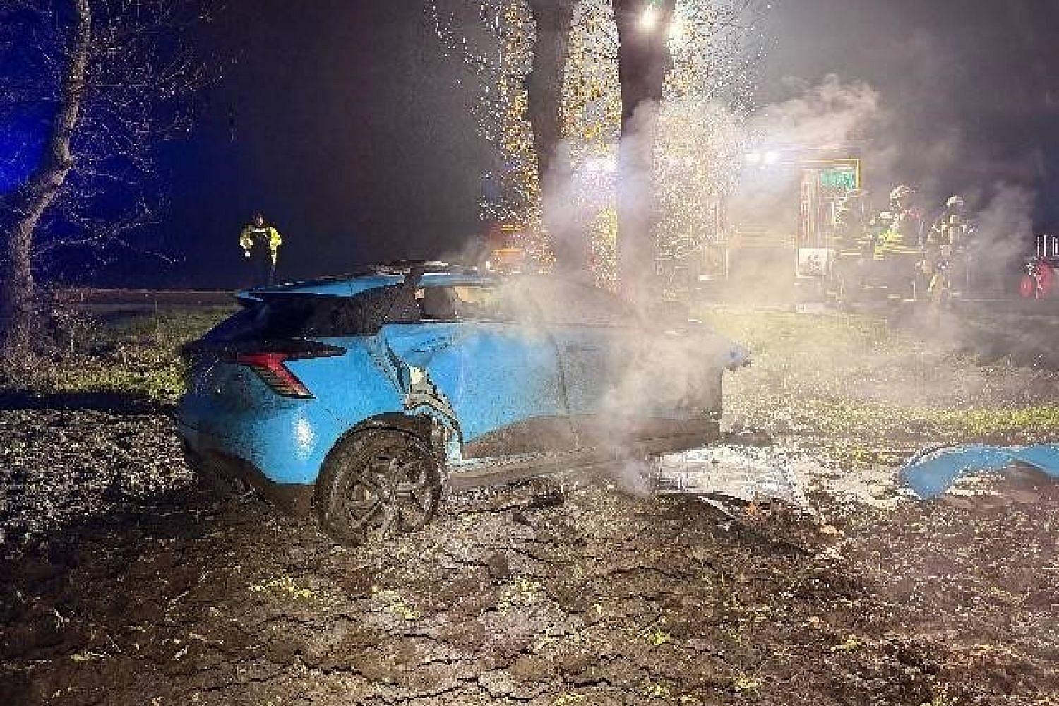 Nach ersten Erkenntnissen der Polizei kam der Fahrer eines Elektro-Pkw in einer Rechtskurve nach links von der Fahrbahn ab und prallte gegen einen Baum. Anschließend brach im Frontbereich des Fahrzeugs ein Feuer aus.