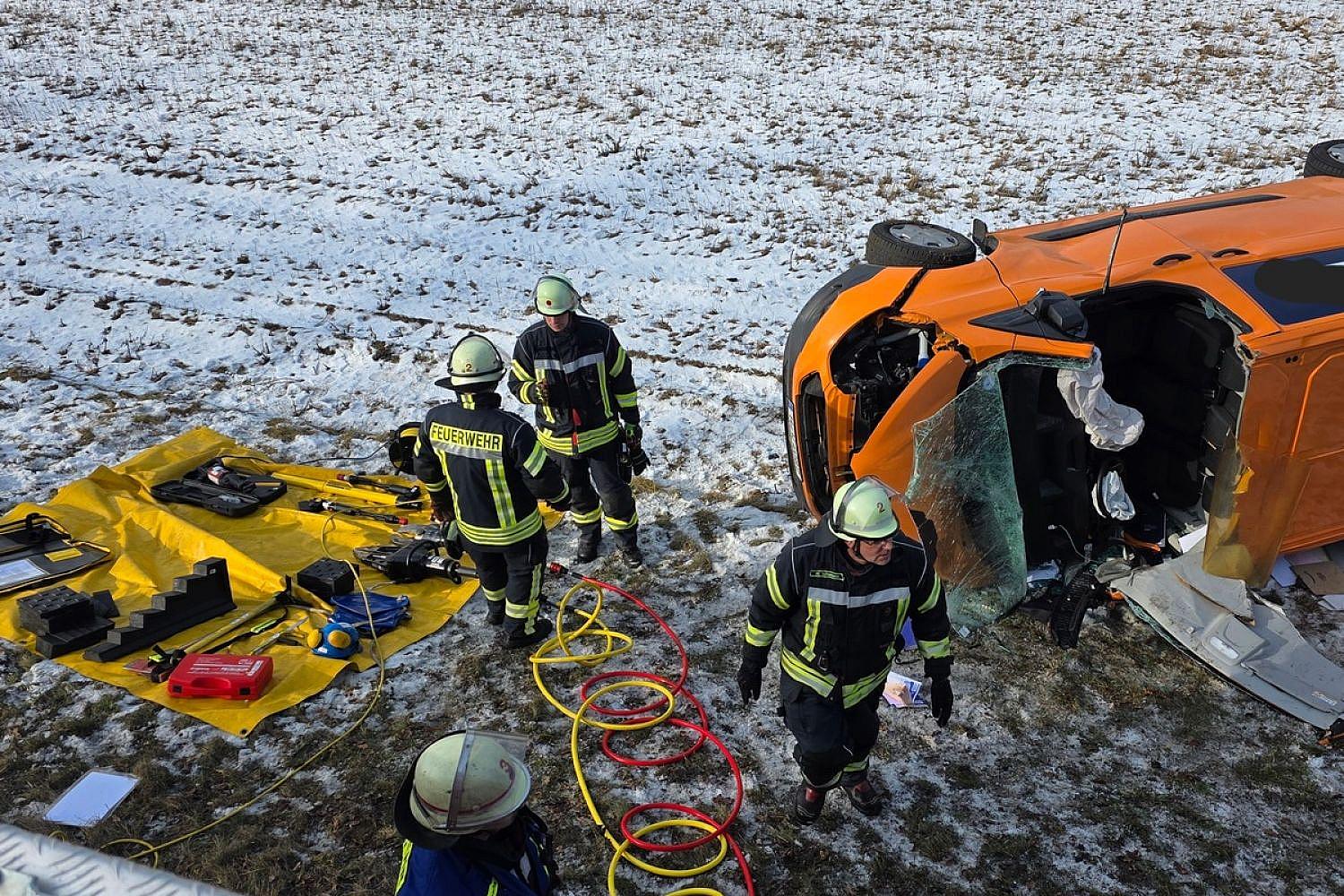 Ein Transporter lag auf der Fahrerseite auf einem Feld, der Fahrer war darin eingeklemmt.