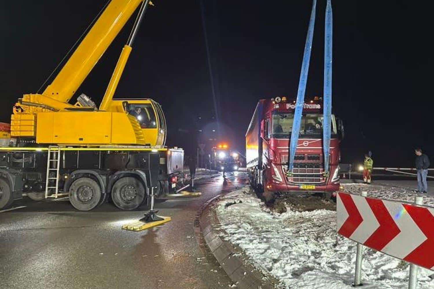 Der LKW mit Anhänger rutschte in die Innenfläche des Kreisverkehrs.