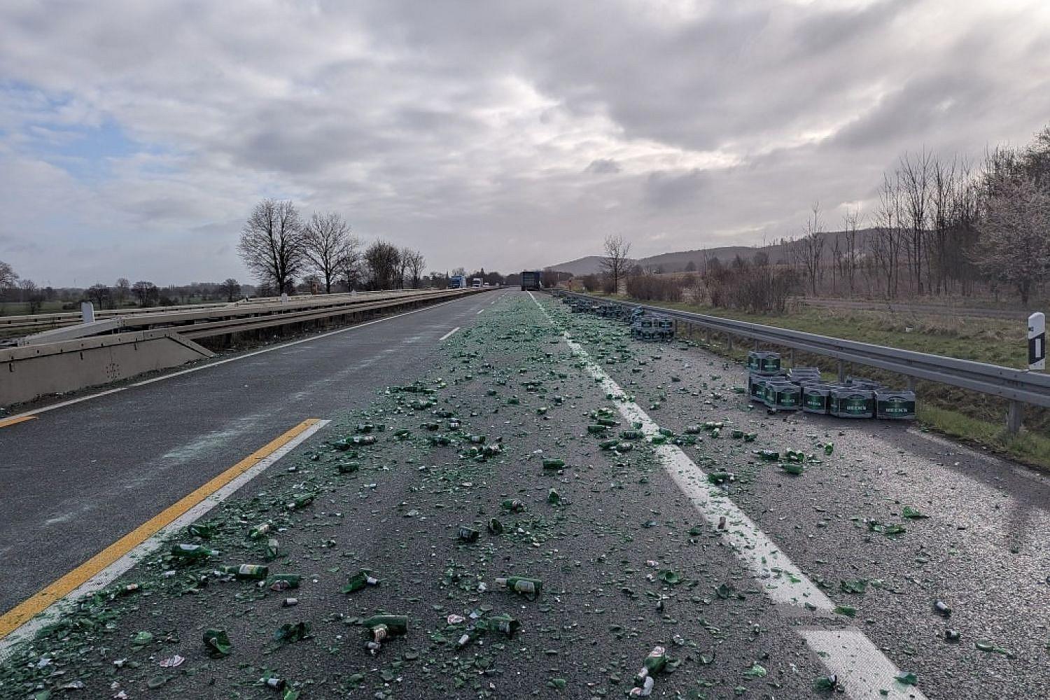 - Ladung (Getränkekisten mit Glasflaschen-Leergut) verrutschte und setzte sich über alle Fahrstreifen.
