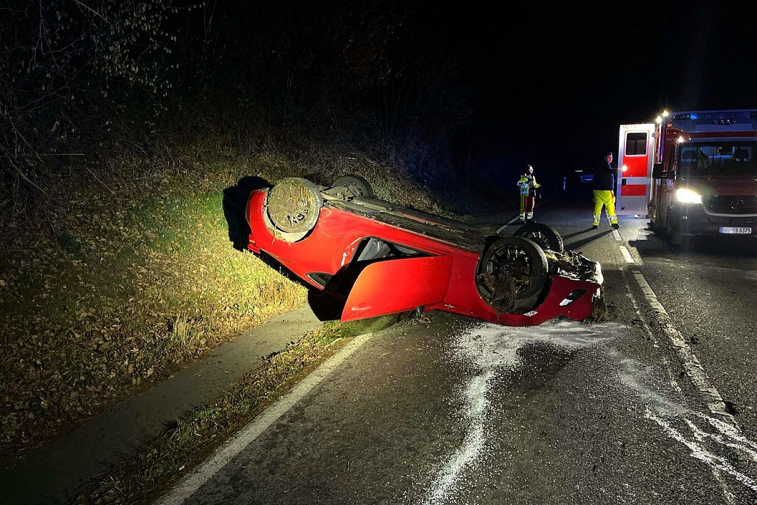 Der Wagen blieb auf dem Dach liegen. Als mögliche Unfallursache nennt die Polizei nicht angepasste Geschwindigkeit bei winterlicher Glätte.