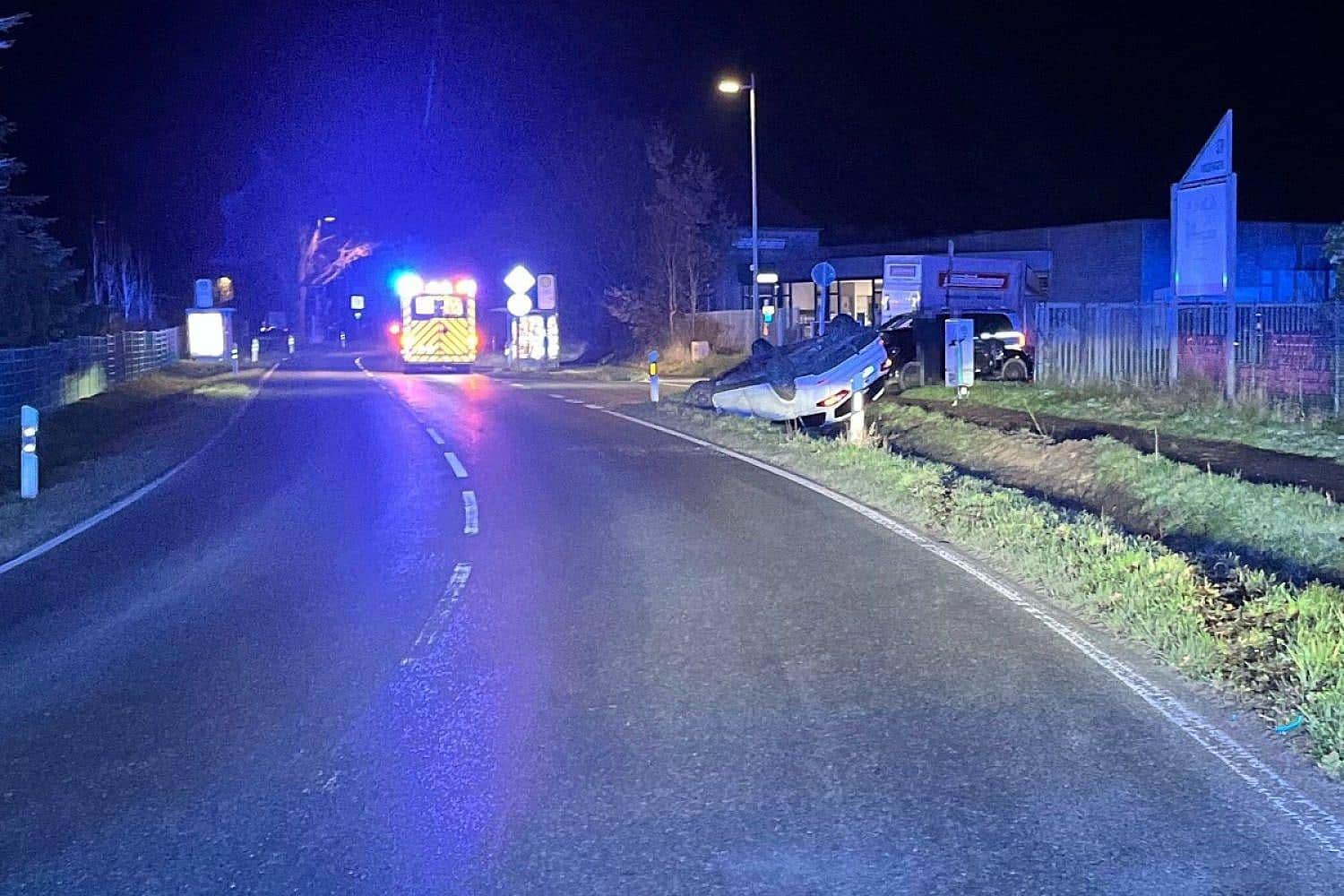 Der Wagen überschlug sich und blieb auf dem Dach liegen. Aus dem Fahrzeug stiegen fünf Personen aus, von denen sich drei in Richtung der Straße Auf dem Esch entfernten.