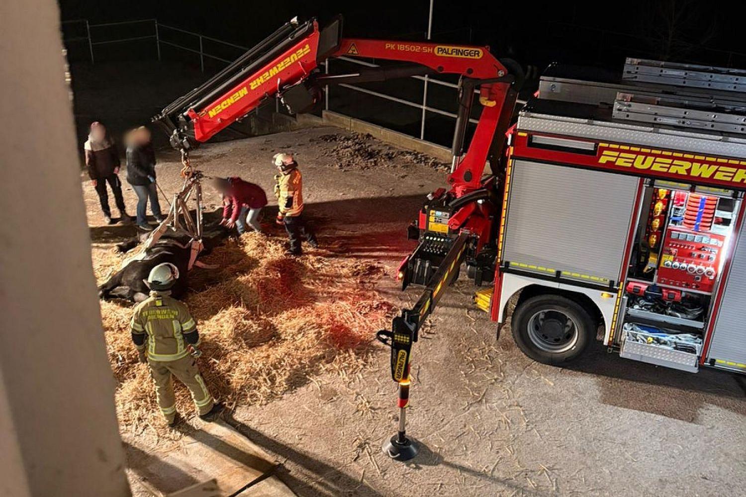 Die Feuerwehrleute bauten ein spezielles Großtierhebegeschirr ein und hoben das Pferd damit sicher hoch.