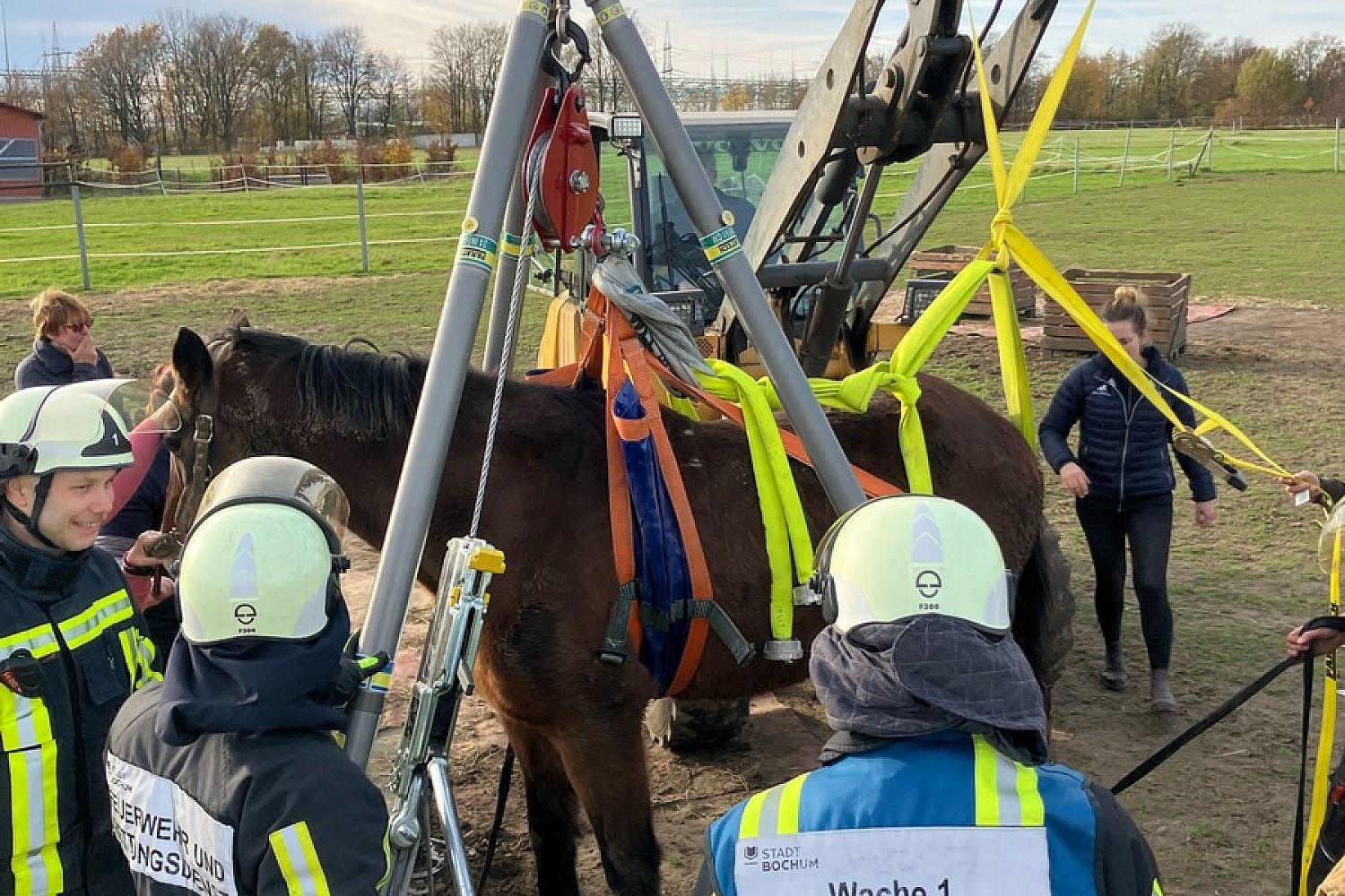Vor Ort versorgte eine Tierärztin das Pferd. Für die Rettung setzten die Einsatzkräfte ein Dreibein mit einem speziellen Hebegeschirr für Pferde ein und improvisierten mit Feuerwehrschläuchen.