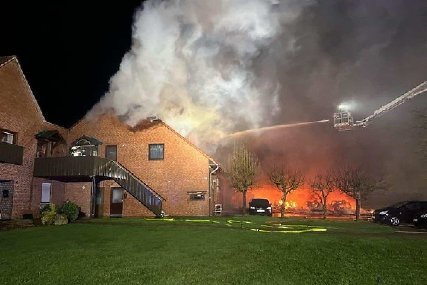 - Nächtlicher Brand in Hille führte zu großem Einsatz von Feuerwehr und Polizei.