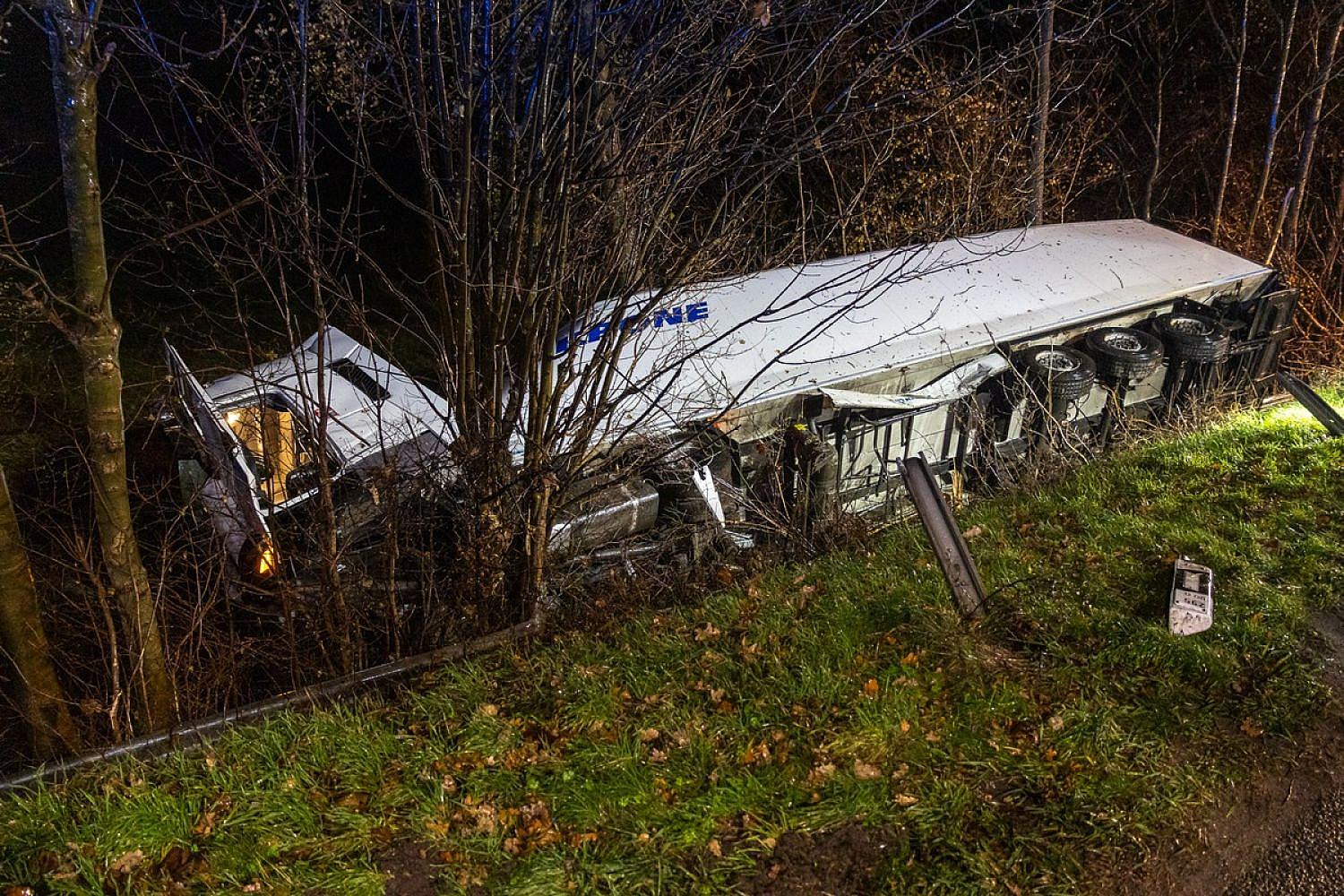 Die Alarmierung erfolgte gegen 22:15 Uhr. Bei Eintreffen der Einsatzkräfte lag der LKW auf der Seite im Bewuchs der Böschung.