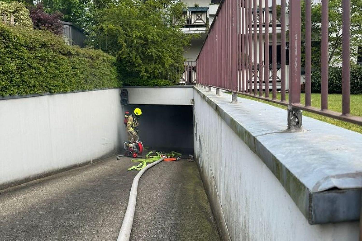 Ein Trupp rückte sofort unter Atemschutz vor, um die Garage abzusuchen, während andere Einsatzkräfte das angrenzende Gebäude und die Umgebung überprüften.