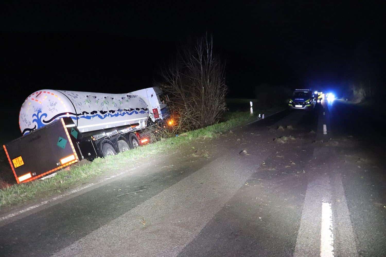 Der entgegenkommende Gefahrgutzug, der mit einem Kohlensäure-Tank beladen war, konnte einen Zusammenstoß nur durch Ausweichen nach links verhindern, landete dabei jedoch ebenfalls im Straßengraben. Der Lkw-Fahrer wurde leicht verletzt, während die VW-Fahrerin schwer verletzt und in ihrem Fahrzeug eingeklemmt war.